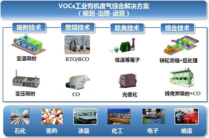 VOCs處理方法有數(shù)十種,其原理主要有回收有價(jià)值溶劑的回收技術(shù)和分解VOCs分子的破壞技術(shù)兩大類,實(shí)際應(yīng)用中更多是采用組合式技術(shù)。比如:采用濃縮和燃燒結(jié)合的技術(shù)治理低濃度大風(fēng)量廢氣,減少裝置投資;采用催化燃燒(CO)或蓄熱式燃燒(RTO)技術(shù)實(shí)現(xiàn)低能耗下VOCs的處理;根據(jù)VOCs自身溶解度、沸點(diǎn)等特性選擇變溫吸附或變壓吸附進(jìn)行溶劑的回收,具體如何選擇取決于客戶生產(chǎn)線的工況。