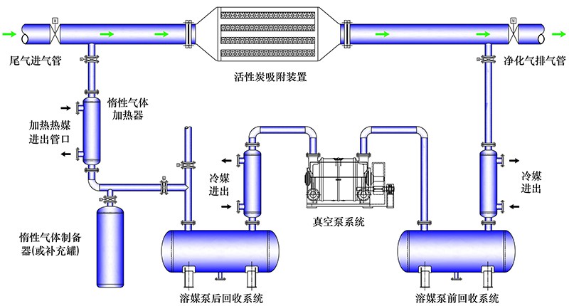 我公司設(shè)計(jì)生產(chǎn)的活性炭脫附裝置,是根據(jù)不同吸附質(zhì)的沸點(diǎn)和臨界點(diǎn),用一定溫度下的惰性氣體將吸附質(zhì)析出。惰性氣體經(jīng)過加熱器加熱到一定溫度進(jìn)入飽和活性炭裝置系統(tǒng),惰性氣體將飽和活性炭?jī)?nèi)的吸附質(zhì)加熱到沸點(diǎn),吸附質(zhì)隨小分子惰性氣體揮發(fā)出來進(jìn)入冷凝器通過一次冷媒冷凝,大部分吸附質(zhì)冷凝成液體進(jìn)入溶媒回收系統(tǒng)氣液分離與惰性氣體分開。物質(zhì)的吸附量是隨壓力的升高而升高的,隨壓力的降低而降低。含有少量吸附質(zhì)的惰性氣體經(jīng)真空泵減壓后進(jìn)入二次冷凝器,經(jīng)二次降溫冷凝將少量的吸附質(zhì)分離回收。處理后的惰性氣體再經(jīng)干燥器干燥,加熱器加熱進(jìn)入活性炭吸附裝置,循環(huán)使用。在實(shí)際工作中,這種方法也是常用的脫附方法。